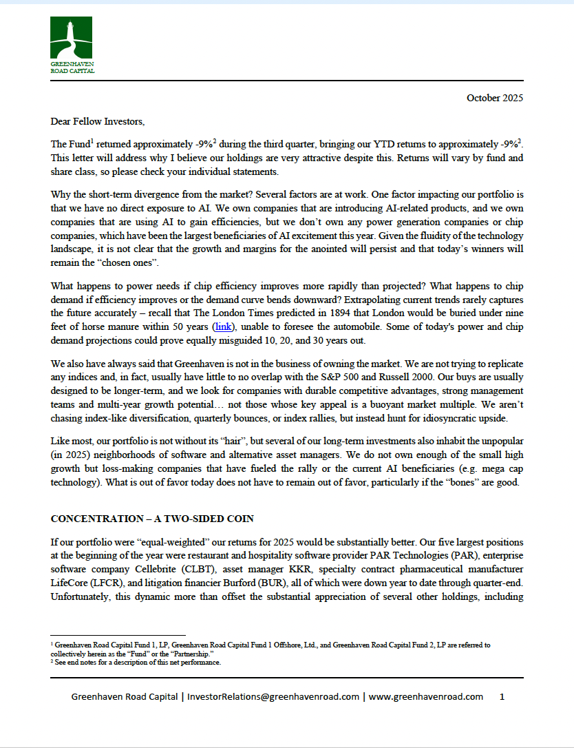 The investor letters outline the fund’s top holdings as well as highlight a recent investment or a current holding. The letters provide an overview of the holdings and the thought process behind specific investments. The letters are one of the best ways to conduct diligence on the fund. To learn more about the fund, or for a complete set of letters please click to –contact us.